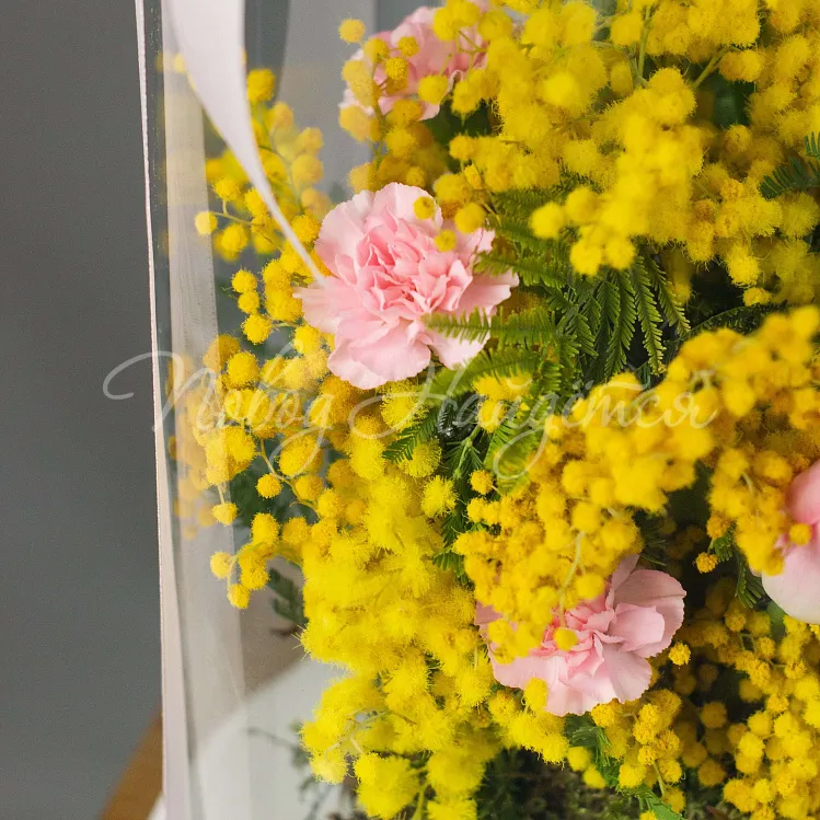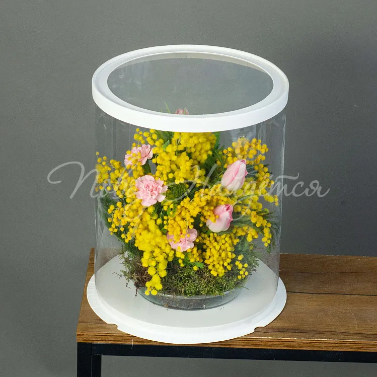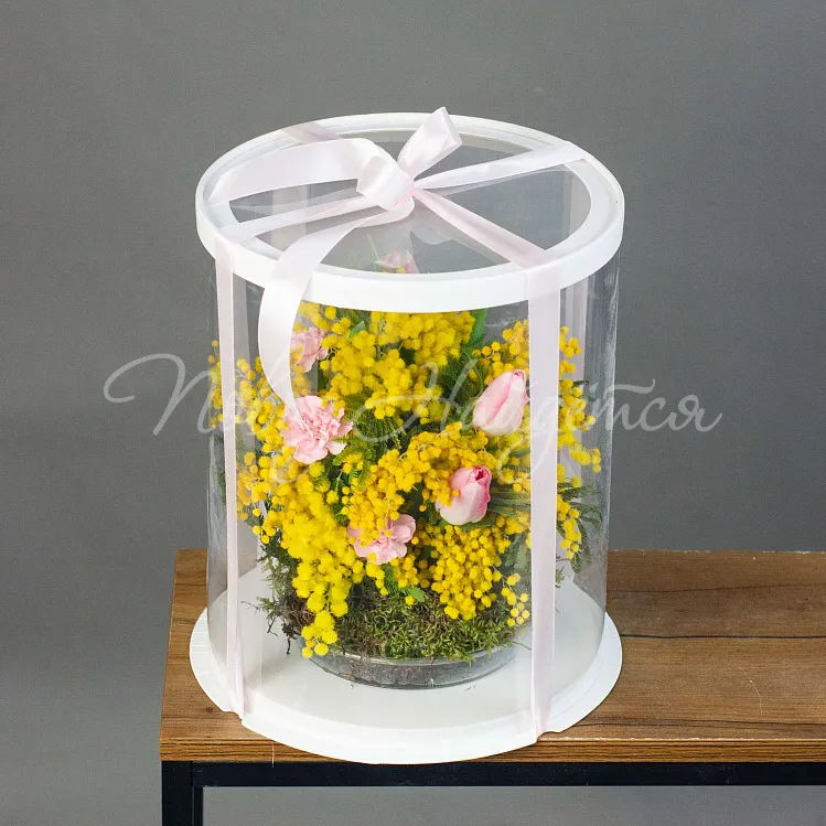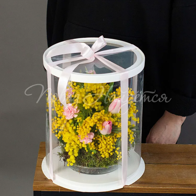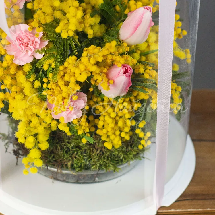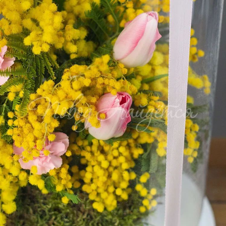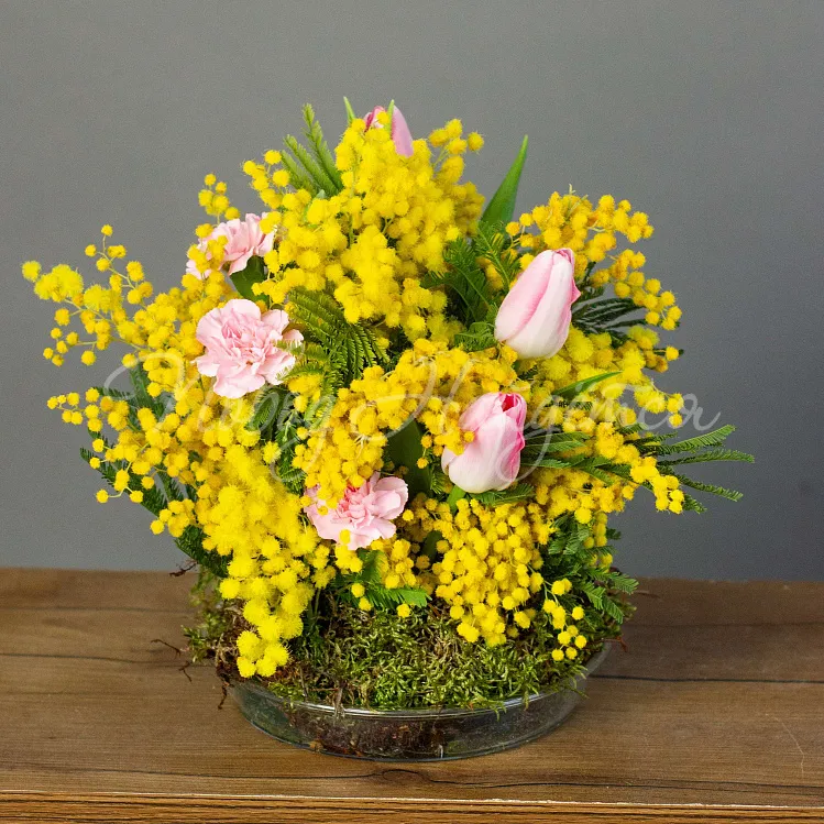 Состав: тюльпан розовый династия 2шт, диантус розовый кустовой 1 шт, мимоза 1/5, мох, биофлора, поддон прозрачный.