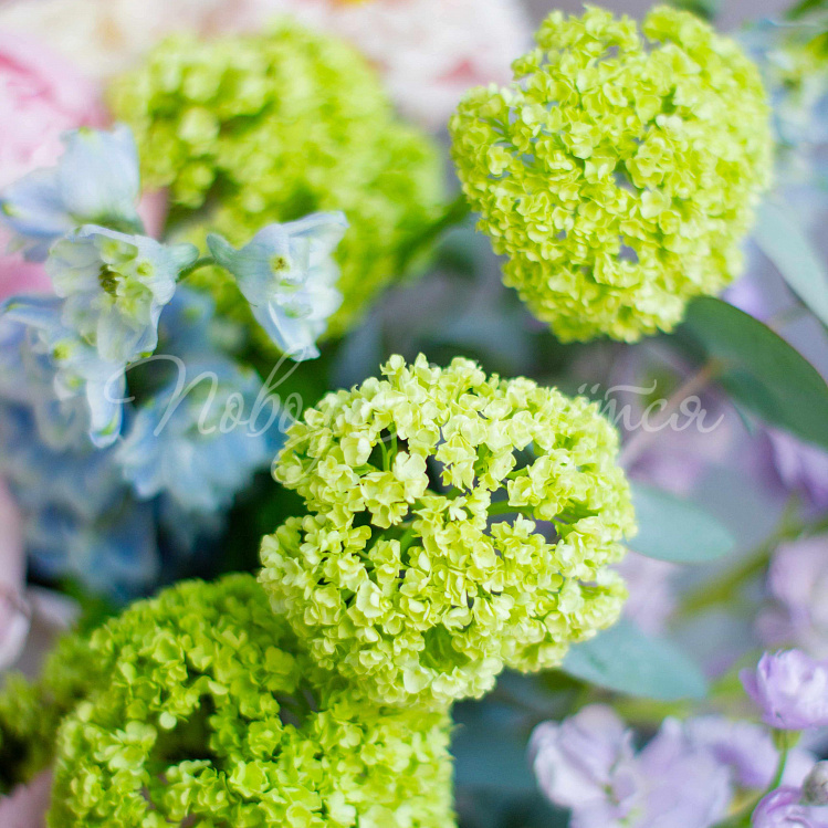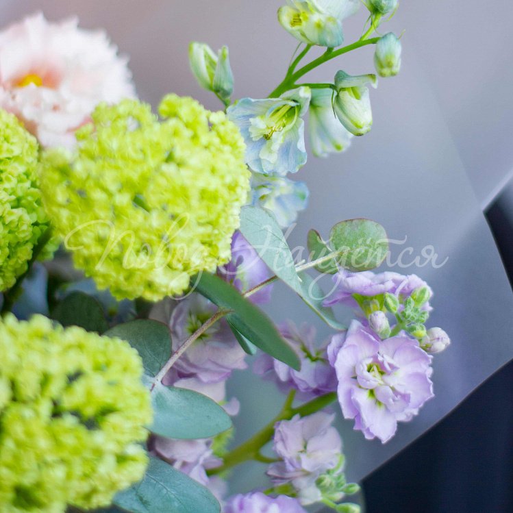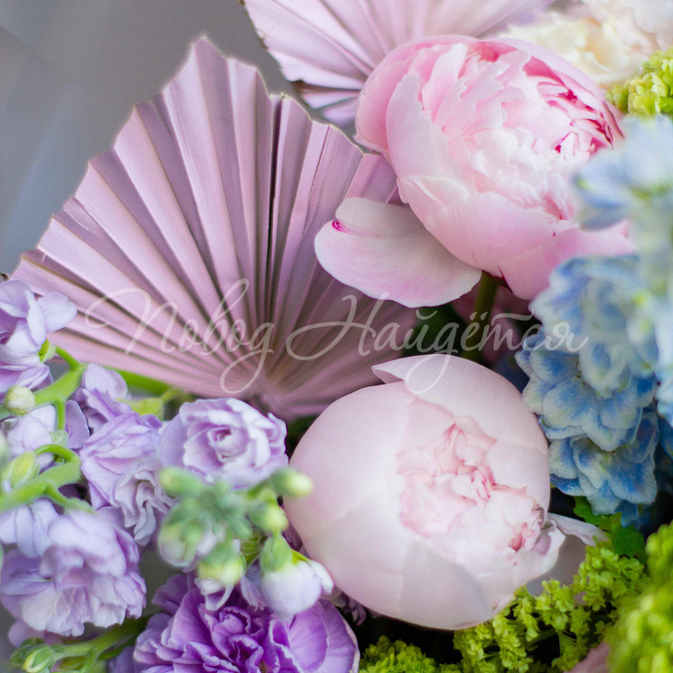 Состав: пион сара бернар 2шт, вибурнум зеленый 2шт, дельфиниум 2шт, матиола лавандовая кустовая 2шт, алиса розовая 2шт, сухоцвет ромб розовый 2шт, писташ.