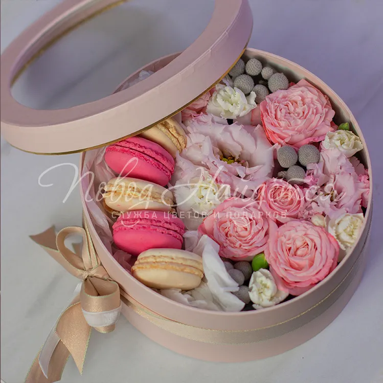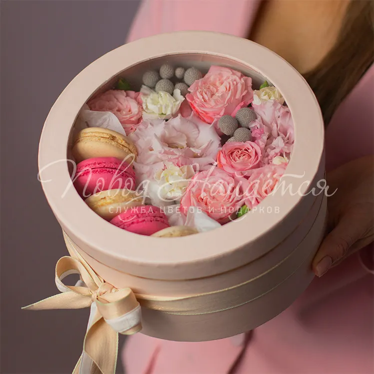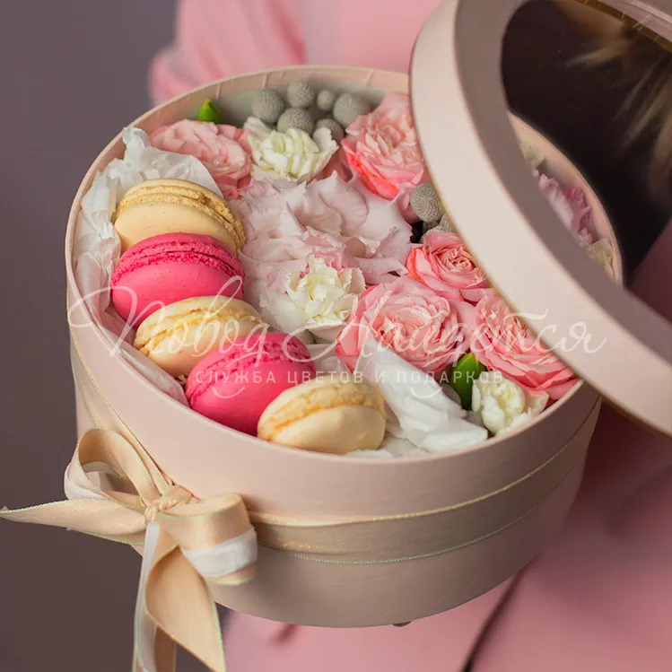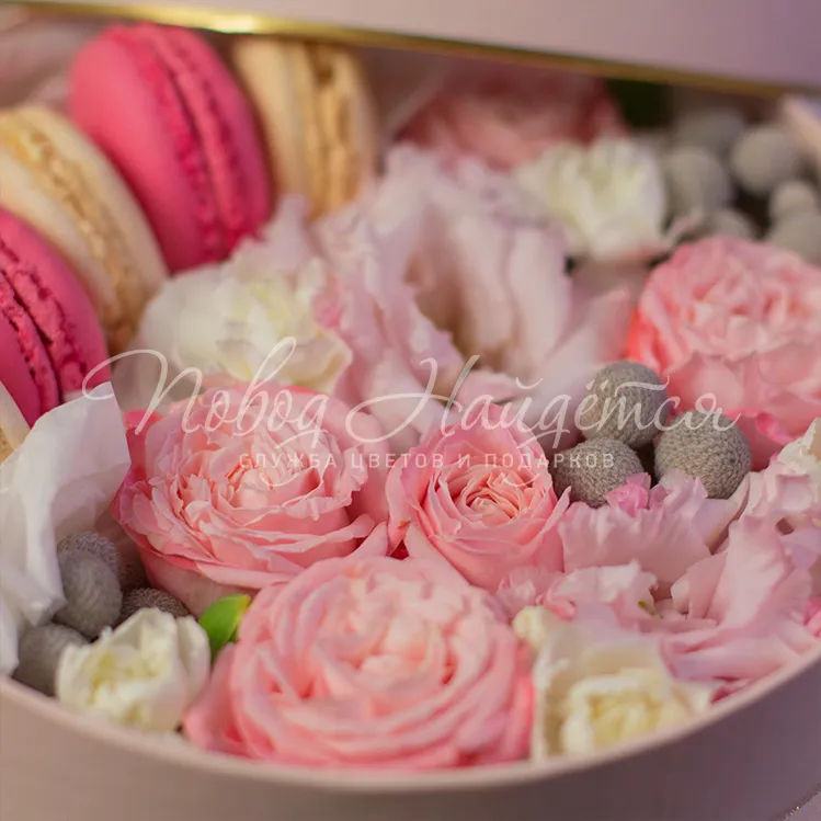 коробка с цветами и макарун