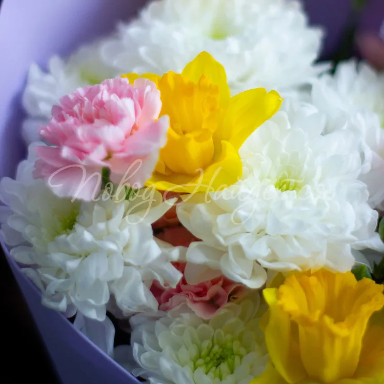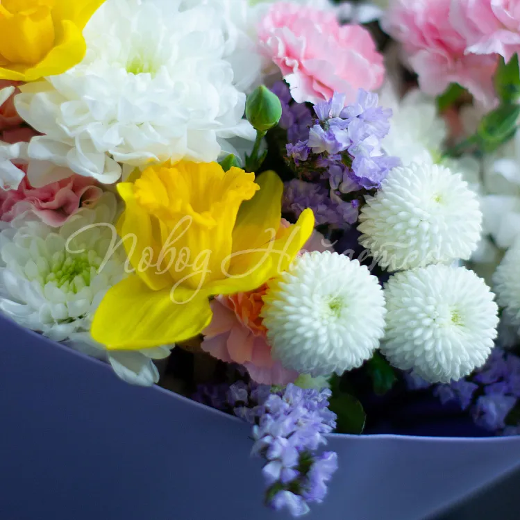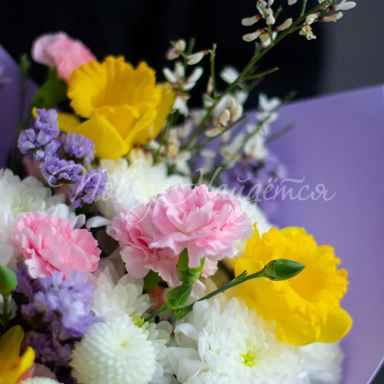 Состав: нарцисс желтый одноголовый 5шт, гениста 1шт, статица лавандовая 2шт, диантус розовый кустовой 4шт, хризантема евро белая 2шт, сантини белая 1шт, писташ.