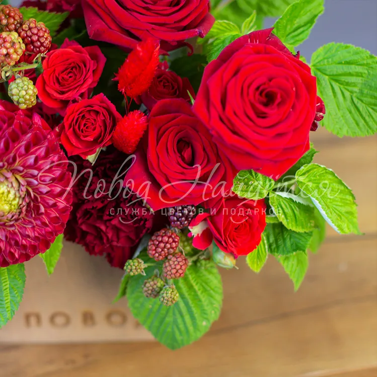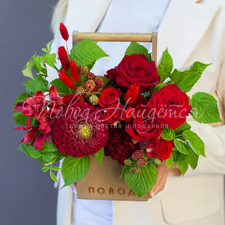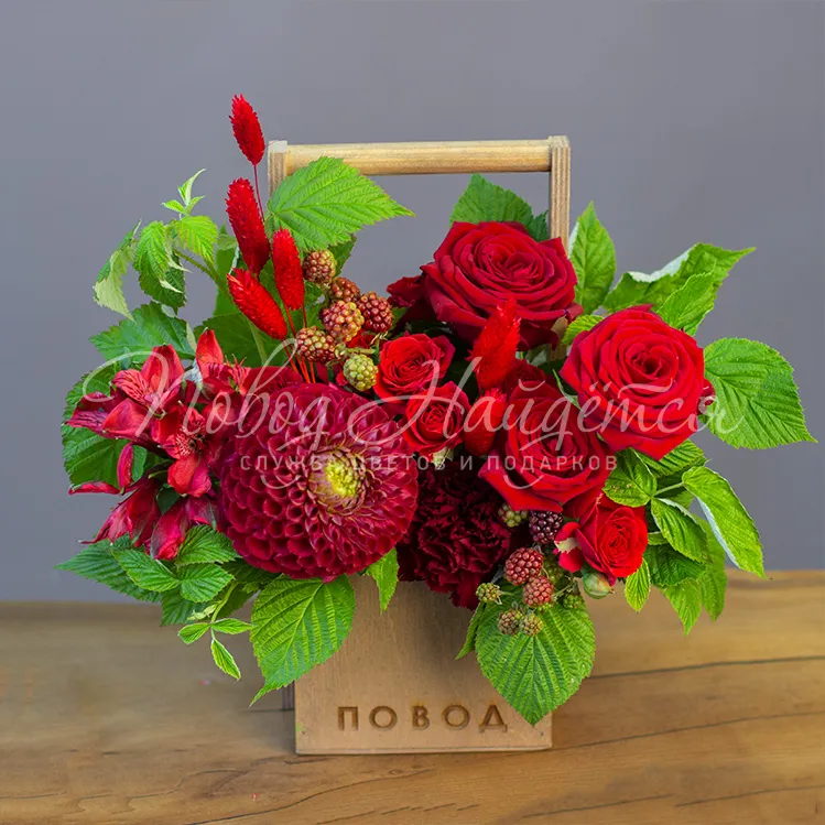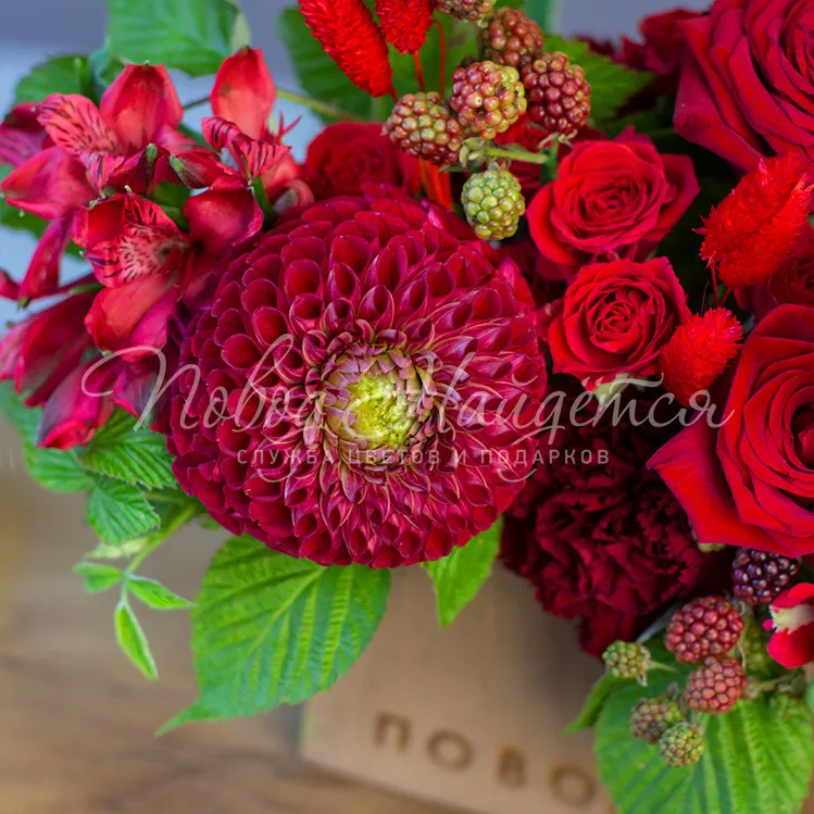 Состав: роза красная(россия) 5шт, георгин бордовый 1 шт, роза кустовая красная 2 шт, диантус бордовый 3 шт, рубус 1 шт, альстромерия красная 1 шт, малина зелень 0.3 шт,сухоцвет лагурус красный 0.1 шт