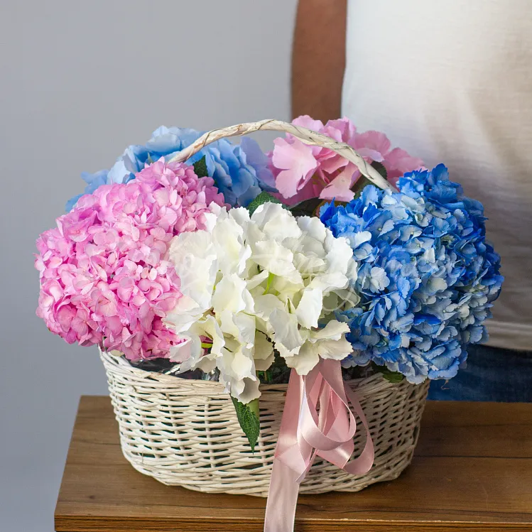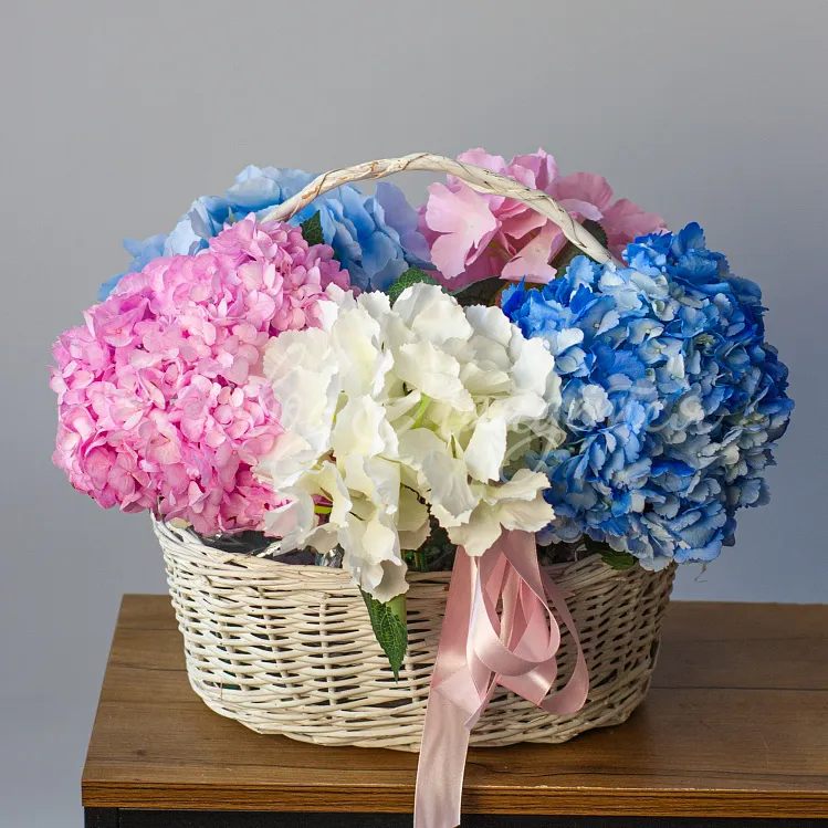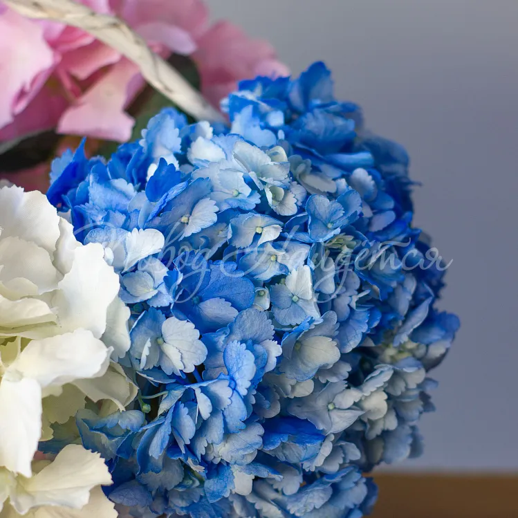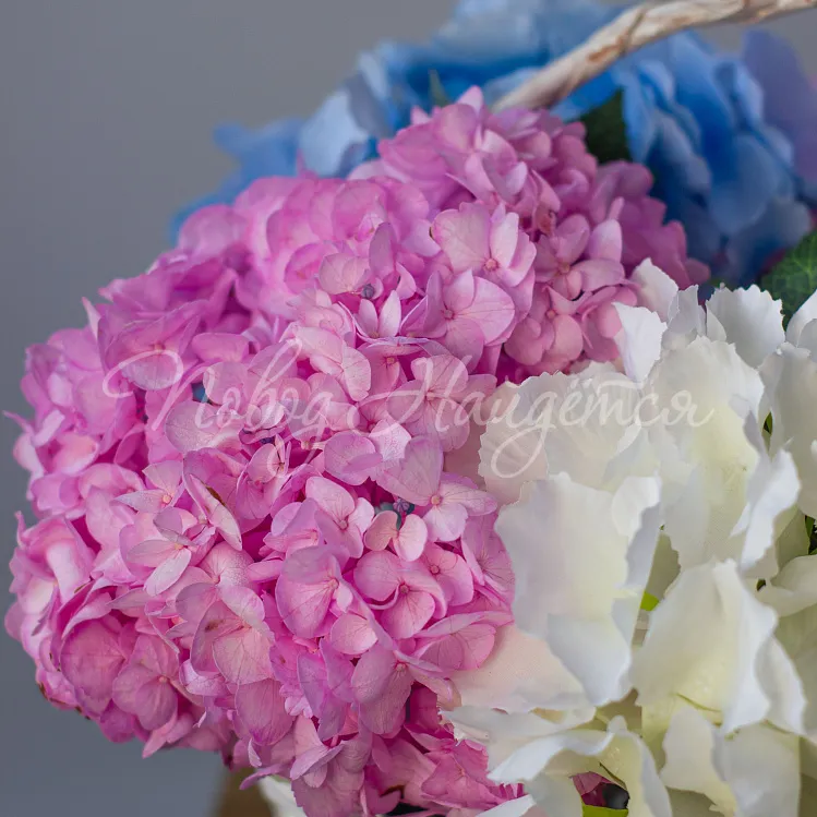 Состав: гортензия кения белая 1шт, гортензия кения голубая 2шт, гортензия кения розовая 2шт, рускус 2шт.