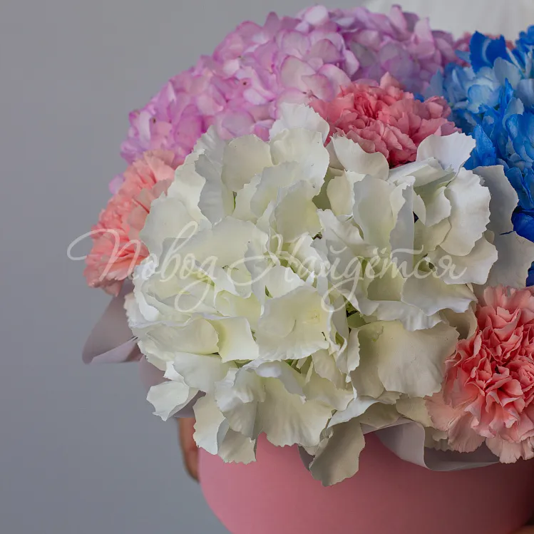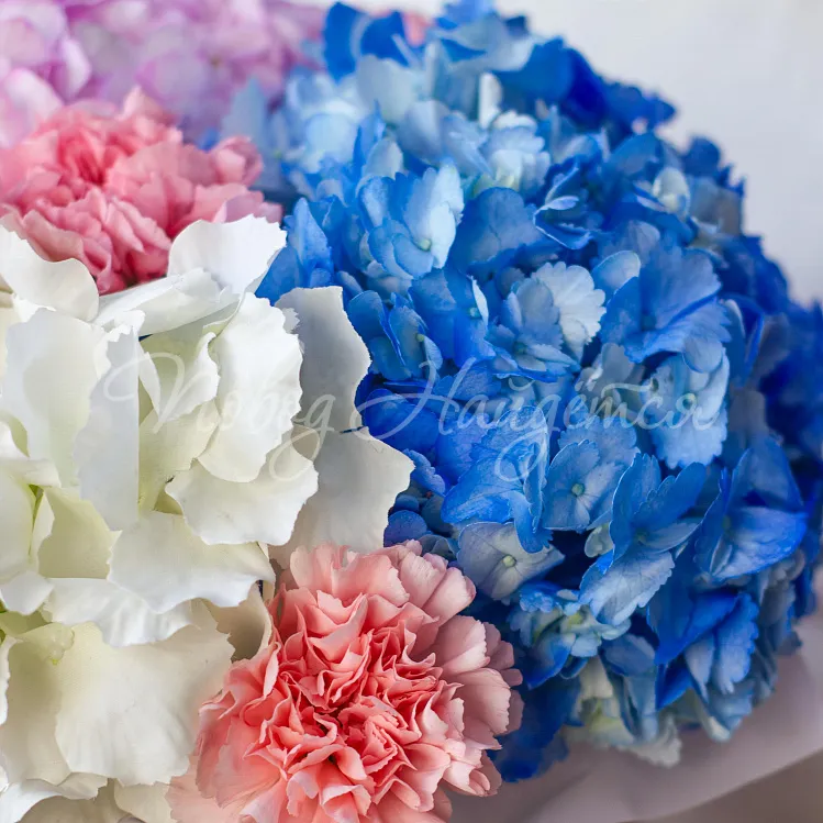 Состав: гортензия кения белая 1шт, гортензия кения розовая 1шт, гортензия голубая 1шт, диантус розовый одноголовый 4шт.