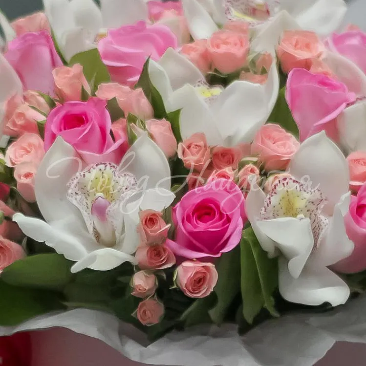Состав: роза "аква" - 10шт, орхидея цимбидиум белая - 11шт, роза кустовая "лидия" - 15шт, салал.